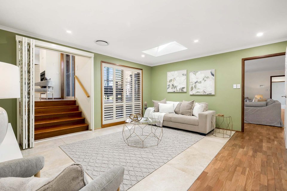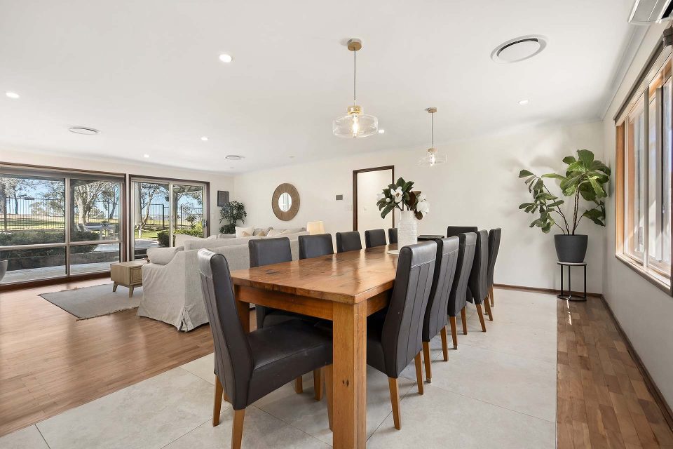 This property features three separate living areas, including a formal sitting room at the front of the home, a family room, and a large open-plan living-dining space that accommodates a 12-seat dining table, providing ample room for the whole family to spread out.