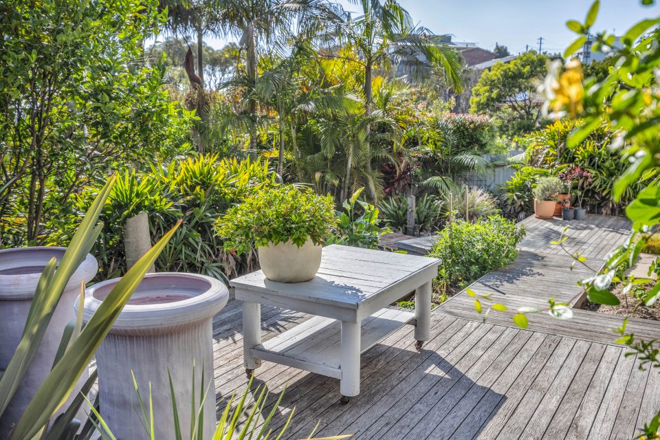 Lush native palms, ferns and shrubs create a low-maintenance oasis around the home. Timber walkways wind throughout, leading to a handy outdoor shower.