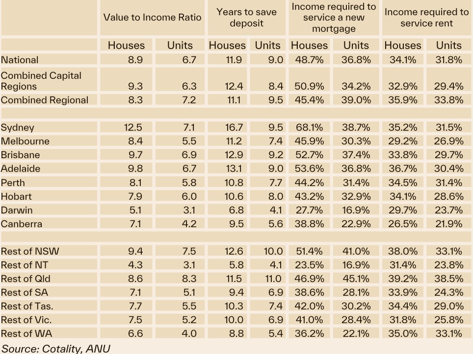 The data shows the two-tier nature of the Canberra market, with the median unit value 4.2 times the median income, requiring 5.6 years to save a deposit and needing 22.9 per cent of income to service the mortgage.