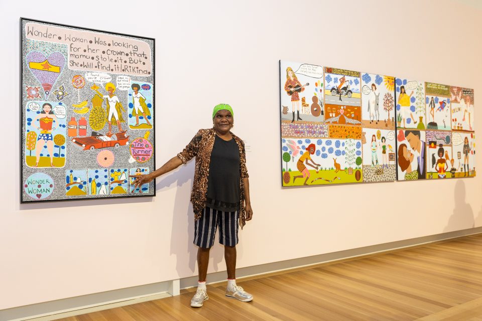 Under the slogan ‘from comic to canvas’, Kaylene Whiskey from her remote community in Indulkana on the APY lands at the Iwantja Arts Centre, creates her colourful hybrid world where Dolly Parton, Tina Turner, Wonder Woman, Whoopi Goldberg and Cat Woman pop in to gather bush tucker or to wish Kaylene Whiskey a happy birthday.