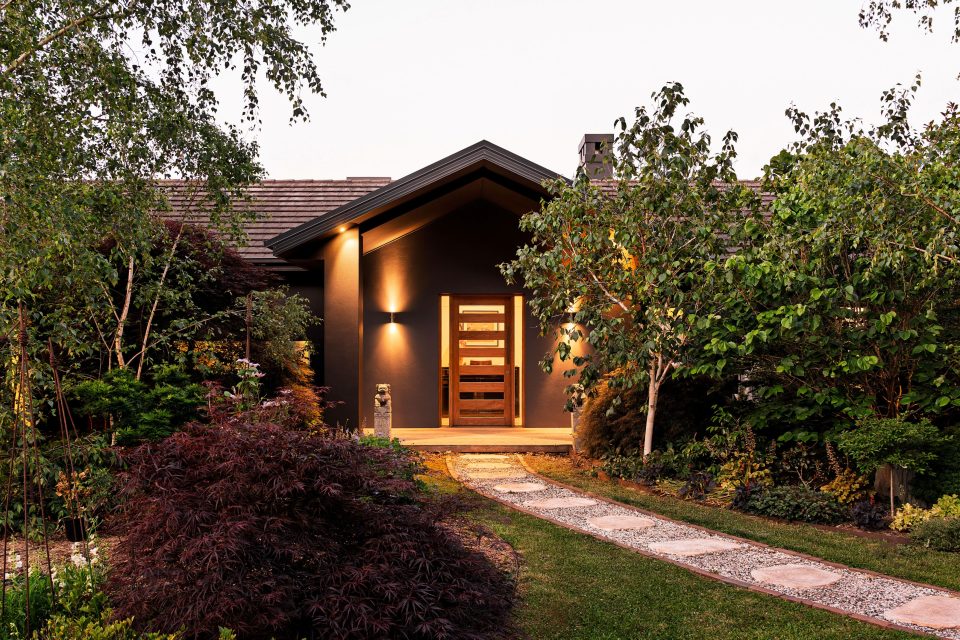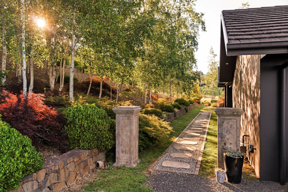 Surrounding the home are vibrant landscaped gardens and mature trees, watered with a sprinkler and drip irrigation system.