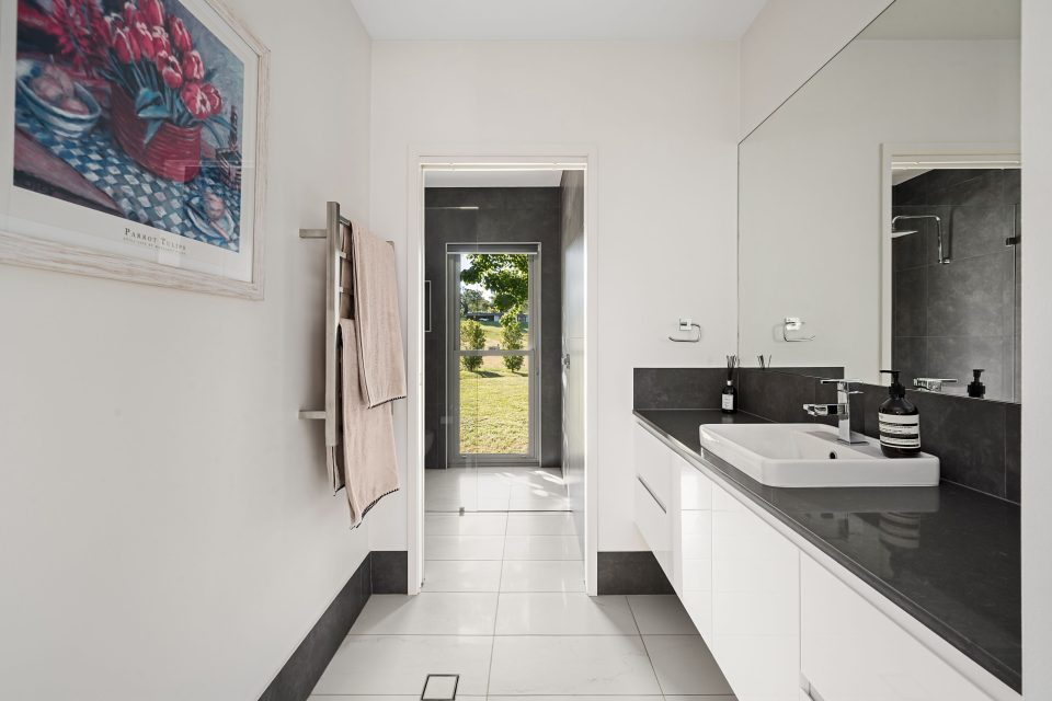 This home’s clever design places the master suite in its own wing. The master bedroom is equipped with a huge walk-through wardrobe and a private ensuite featuring floor-to-ceiling feature tiles, a double vanity, and a full-size bathtub with garden views.