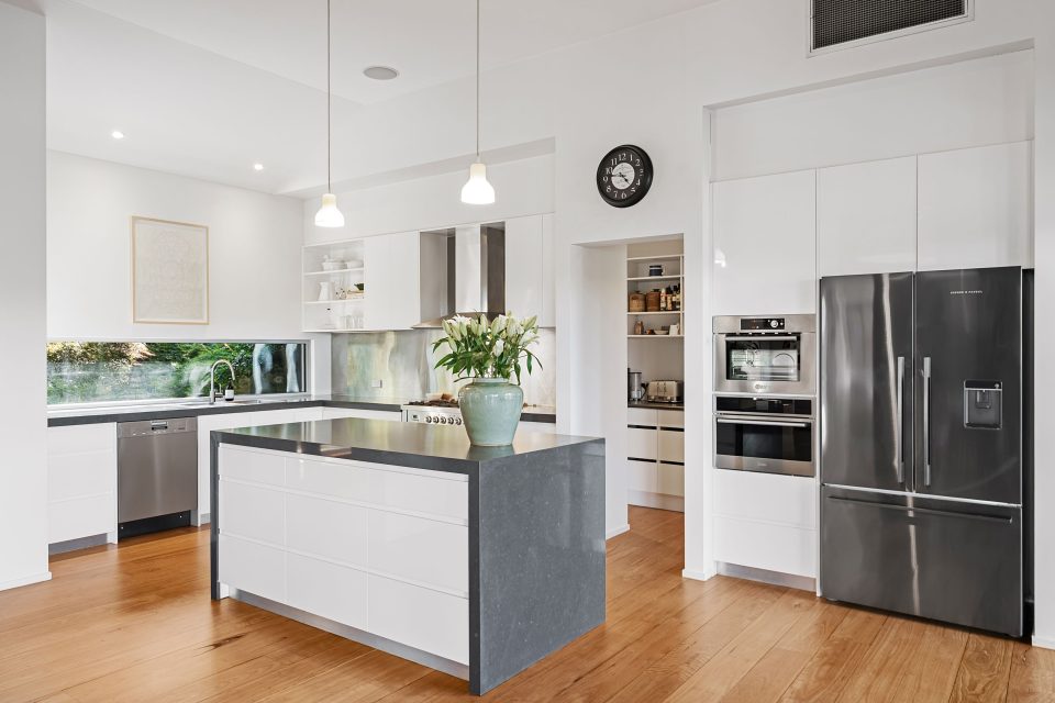 The kitchen is fitted with a butler’s pantry, stone benchtops, soft-close cabinetry and top-quality appliances. Elegant pendant lights hover above the generous island bench, which also serves as extra storage.