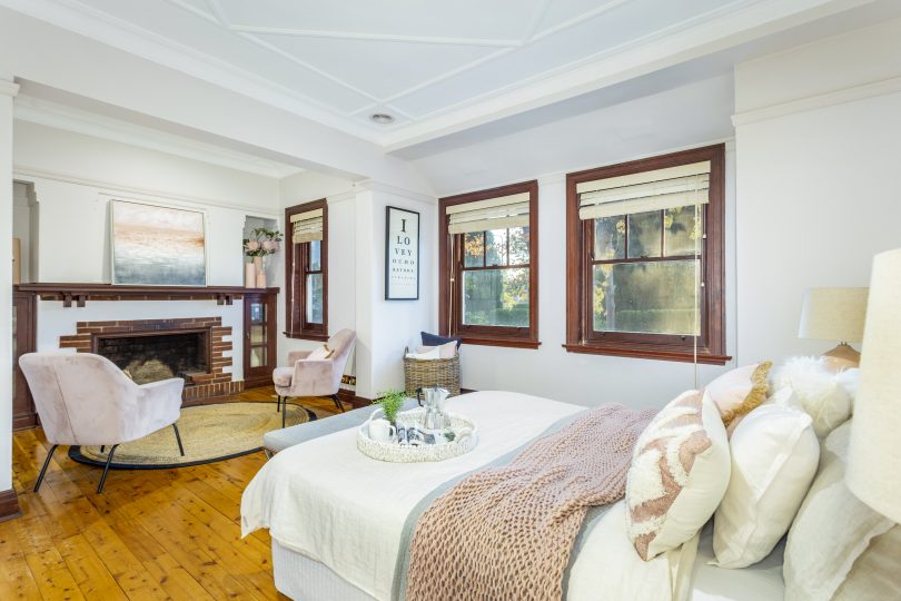 The master bedroom is very large, and has its own fireplace with room for seating around it. This part of the room is historically known as an ‘inglenook’ from the German, meaning ‘angel’s hearth’. Polished floorboards and timber sash windows, and the original fireplace feature gives the room the charm and character of the 1920s. There are three more bedrooms, all of which are large, and one has a study off to the end.