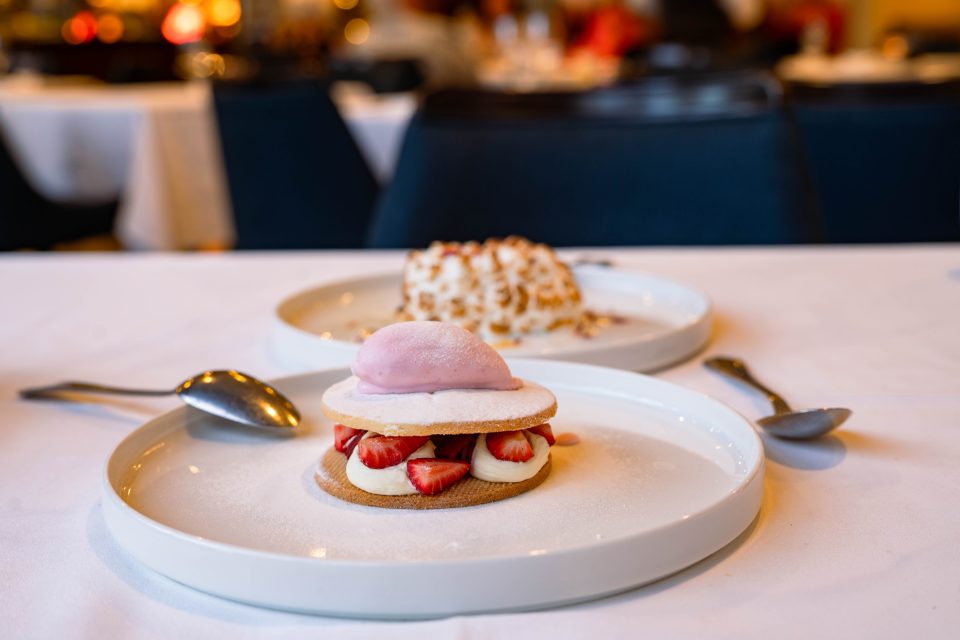 The rhubarb is still crisp, the strawberries fresh and we particularly delight in the luxurious frangipane cream, wedged between thin shortbread discs and topped with strawberry ice cream.