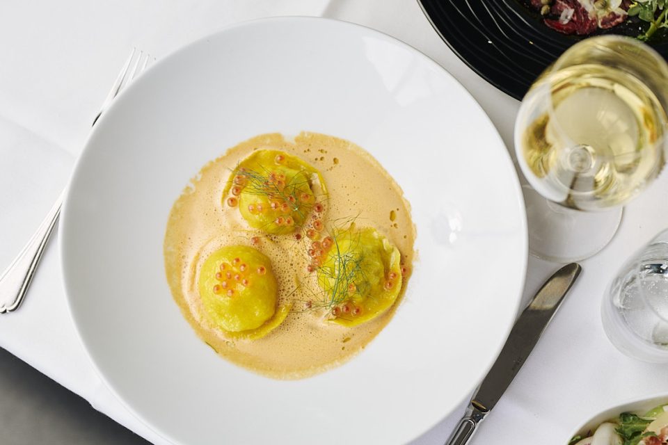Tender barramundi and crab-stuffed ravioli sit in a seafood bisque that perfectly balances light, creamy and oceanic flavours. The salty pop of salmon caviar dances on our taste buds.