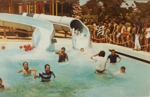 Photo of Macquarie Pool aka Big Splash on the day the brand-new slides opened in summer 1983. Photo: Supplied.