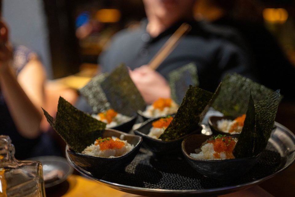 Another new menu item is temaki, which is fun and hands-on. It’s basically DIY sushi that you roll into a cone and eat with your hands. I am relieved to be using my hands because I have not yet managed to place anything into my mouth with chopsticks at this dinner. Miniature nori sheets flank a bowl of steamed rice and creamy blue swimmer crab meat that tastes a little chowder-like. The little tacos are creamy, tender, and comforting.