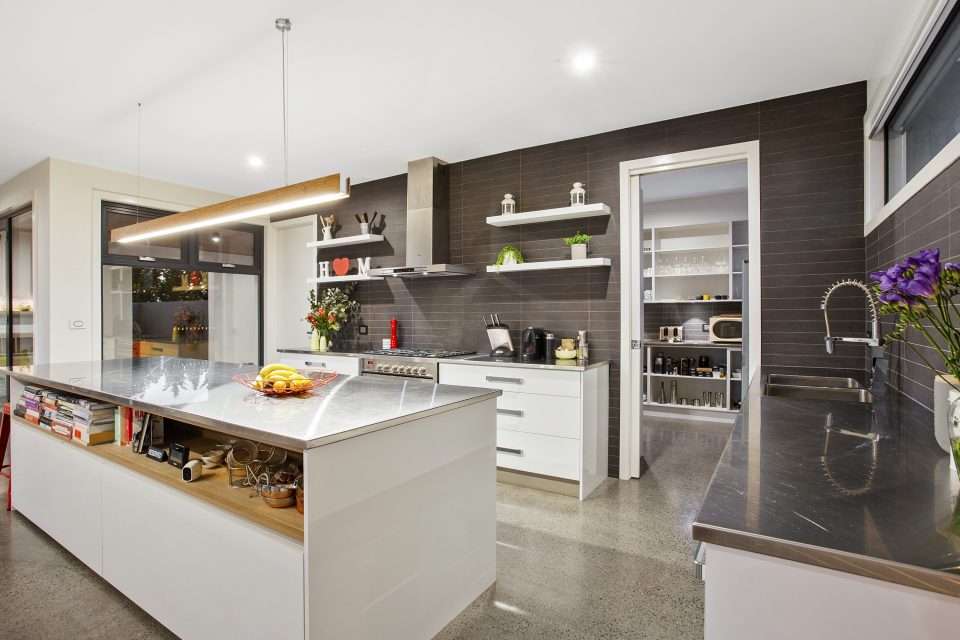 The kitchen is supplemented by an enormous butler’s pantry with room for every conceivable appliance and plenty of storage for dry goods and essential supplies, meal preparation benches, and tiled splashbacks.