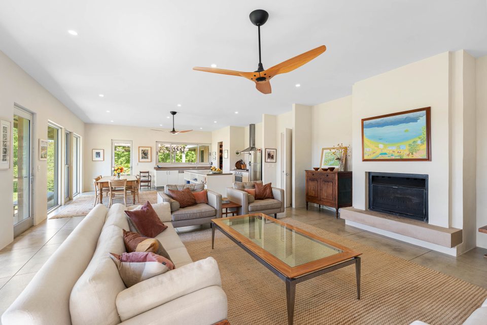 The view paints a stunning backdrop for the open-plan living, dining and kitchen space within, which is kept comfortable by a central fireplace, in-slab heating and contemporary ceiling fans.