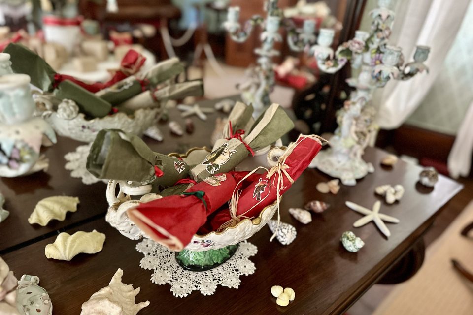 Velvet figurines, glass baubles, candles, and tiny bonbons still kept by the family decorate the tree. The dining table is set for roast goose and Christmas pudding, with “seasonal music” completing the scene.