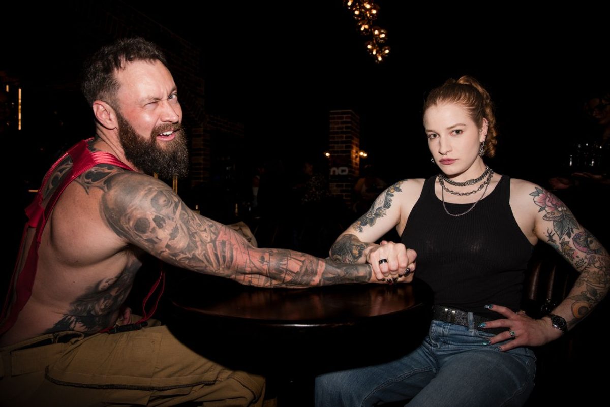Gina chose to arm wrestle the topless waiter at Sexy Trivia Night. Because she could. Photo: Stuart Steenbergen.