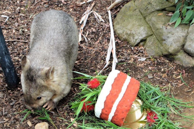 The zoo’s team leader of Australian natives, Dr Danielle Johinke, with Winnie at the wombat’s birthday celebration last year. Photo: Glynis Quinlan.